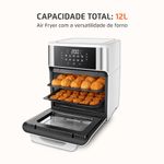 Com capacidade total de 12 litros, o modelo inclui um cesto de 5 litros e três assadeiras antiaderentes, ideais para preparar até três pratos ao mesmo tempo. O controle de temperatura e o timer de 60 minutos ajustáveis permitem elaborar receitas com mais precisão.