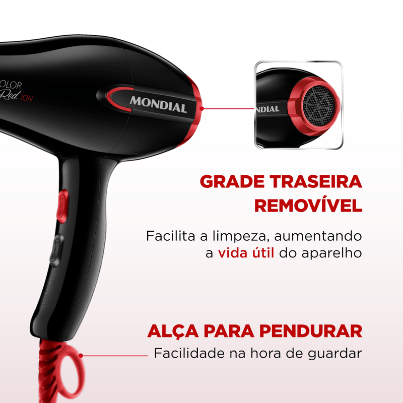 GRADE TRASEIRA REMOVÍVEL: Facilita a limpeza e aumenta a durabilidade do secador de cabelo.